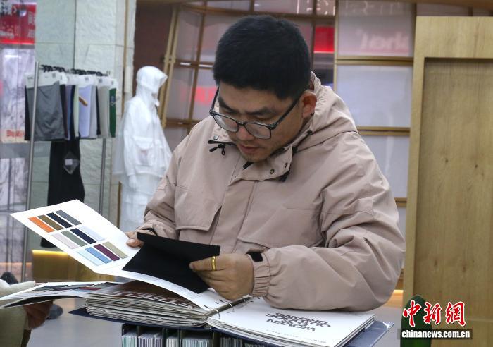 12月24日,推销商细致选择冲击衣里料样本。中新社记者 项菁 摄